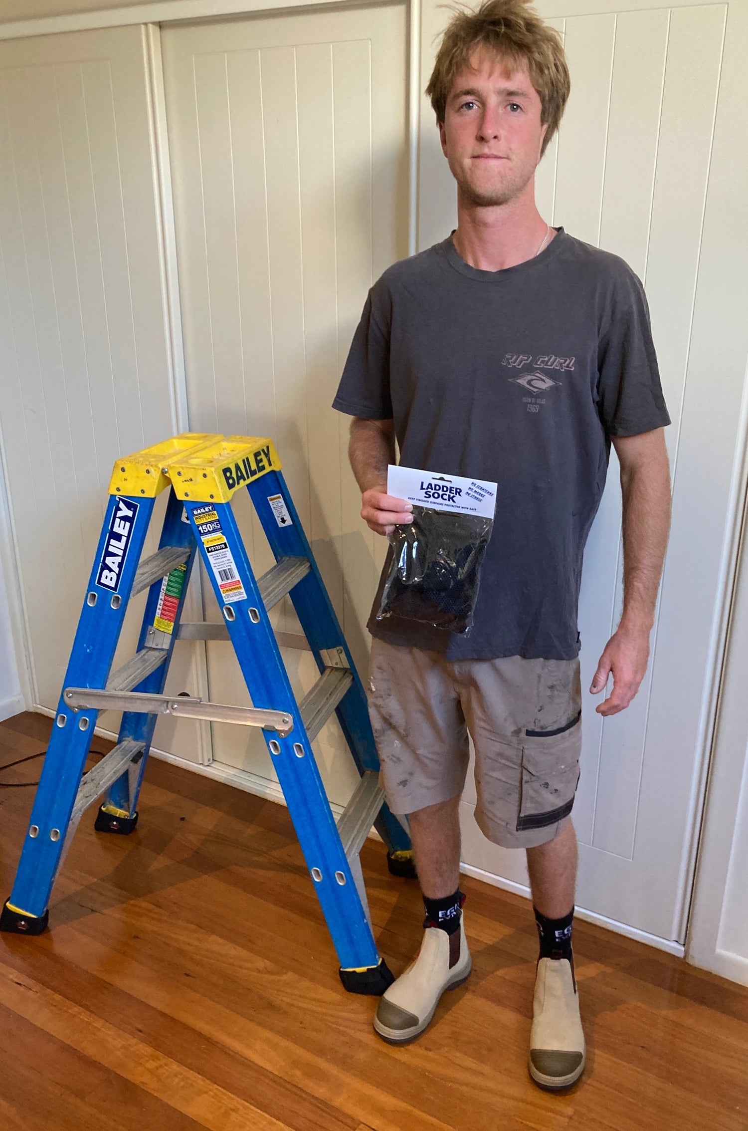 LadderSock is a durable, reusable ladder foot cover designed to prevent scratches, scuffs, and marks on timber, tiles, vinyl, and polished concrete. It slips on easily, stays in place, and provides peace of mind when working in finished homes or commercial spaces.